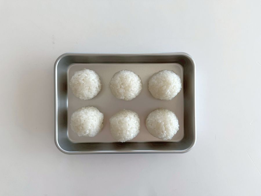 軟飯をラップの上で6等分にし、手のひらで軽く丸める。